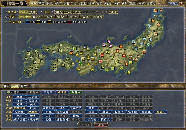 中級プレイで、六角との同盟切ると、足利との連合軍に手を焼くことがわかったので、同盟を延長して、朝倉が一色を攻める時に火事場泥棒…失敗。ま、攻める時に舞鶴に支城作って、ほとんどの集落占領したのでよしとしよう。稲富一族を配下にできなかったけど。そのあと、丹波を攻めて赤鬼青鬼配下に。次に播磨を攻めて如水を配下に…とかやってると、なぜか大友が九州を制覇してきちゃった。2chとか見てると島津が伸びる場合が多いような感じだけど。