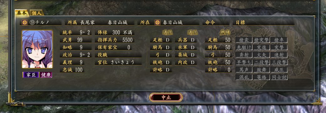 チルノの能力www。さすがまるきゅーはバカだ!しかし官位のせいで統率と政治が11になっちゃってショボーン。