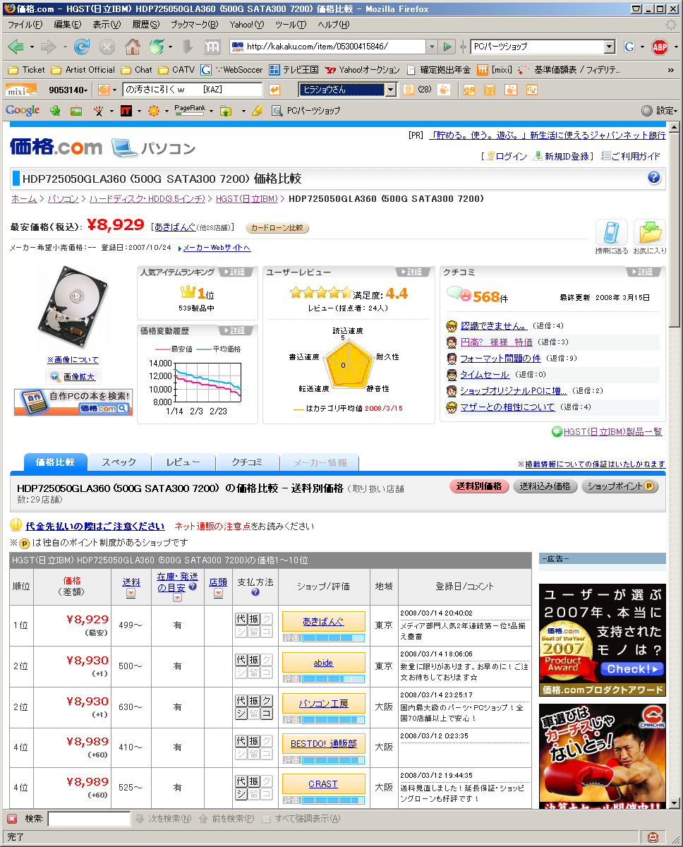 なんだこの「価格変動履歴」は。このひと月足らずで2000円くらい下がってる?円高だからか?年度末だからか?もうちょっと待てばもっと下がるのか?w