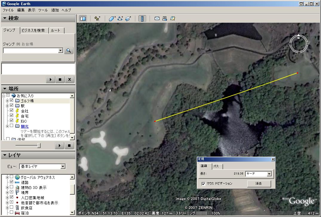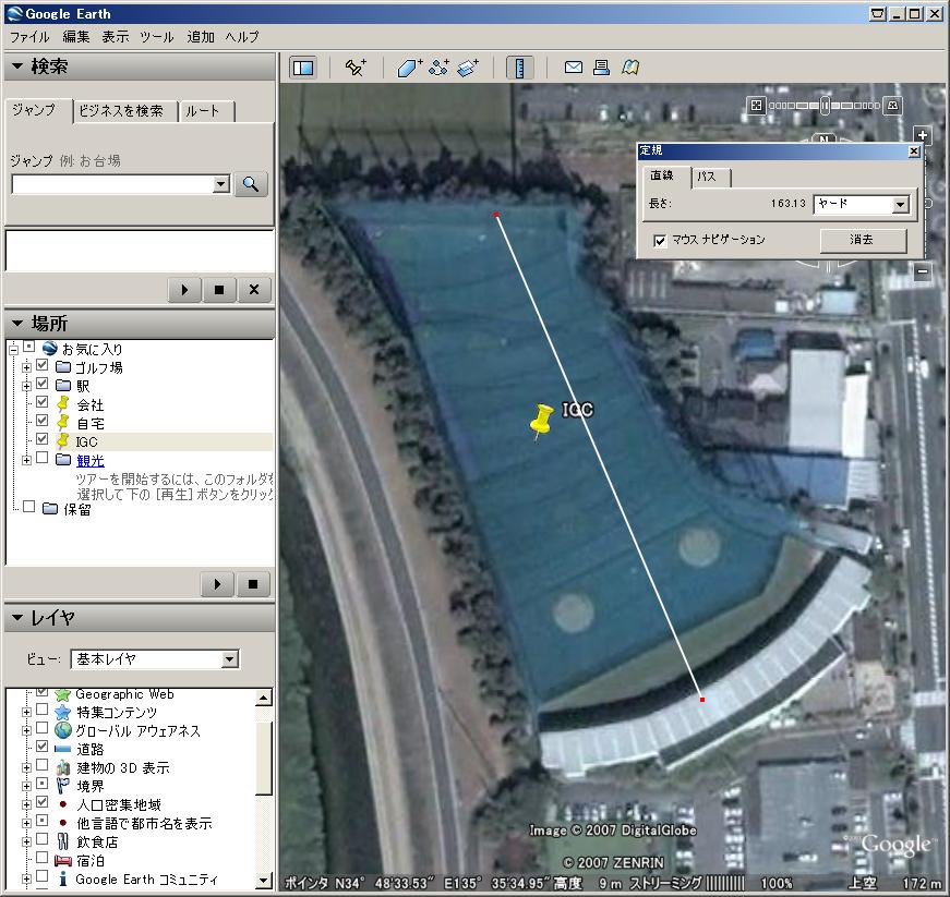 これが、昨日書いた、いきつけの練習場です。衛星写真では実際のグリーンの位置がわからないのでじゃっかん不正確ですが、だいたい図の位置くらいに180の看板があるのですが…実際は163ですか…。