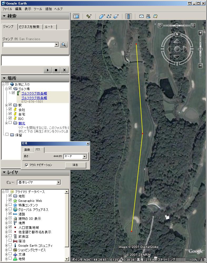 お次は、以前の日記で書いた、三田ゴルフクラブの超打ちおろし。表示では317ですが、直線距離ではどうでしょうか、ということで調査。293ヤードですか。ブラインドの打ち下ろしなので危険。まあ、私がワンオンした記念のホールということで。