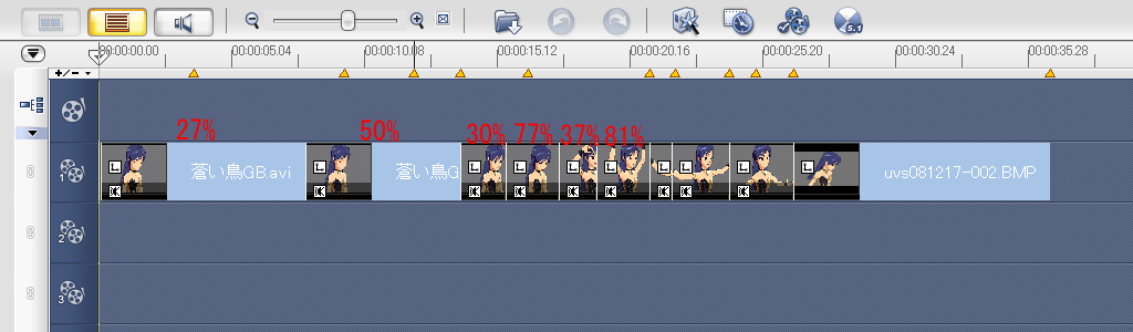 今回、作り方をがらっと変えました。というか、ダンス素材はほぼ蒼い鳥とmy songですが、この2曲は拍をとらない部分が多いので、元の音楽に合わせてダンスのPlayback speedを変動為替相場制(誤)にしたものが多いです。わかりにくいか。部分部分とPlayback Speedの関係を絵にしてみました。前奏から、入りの部分ね。